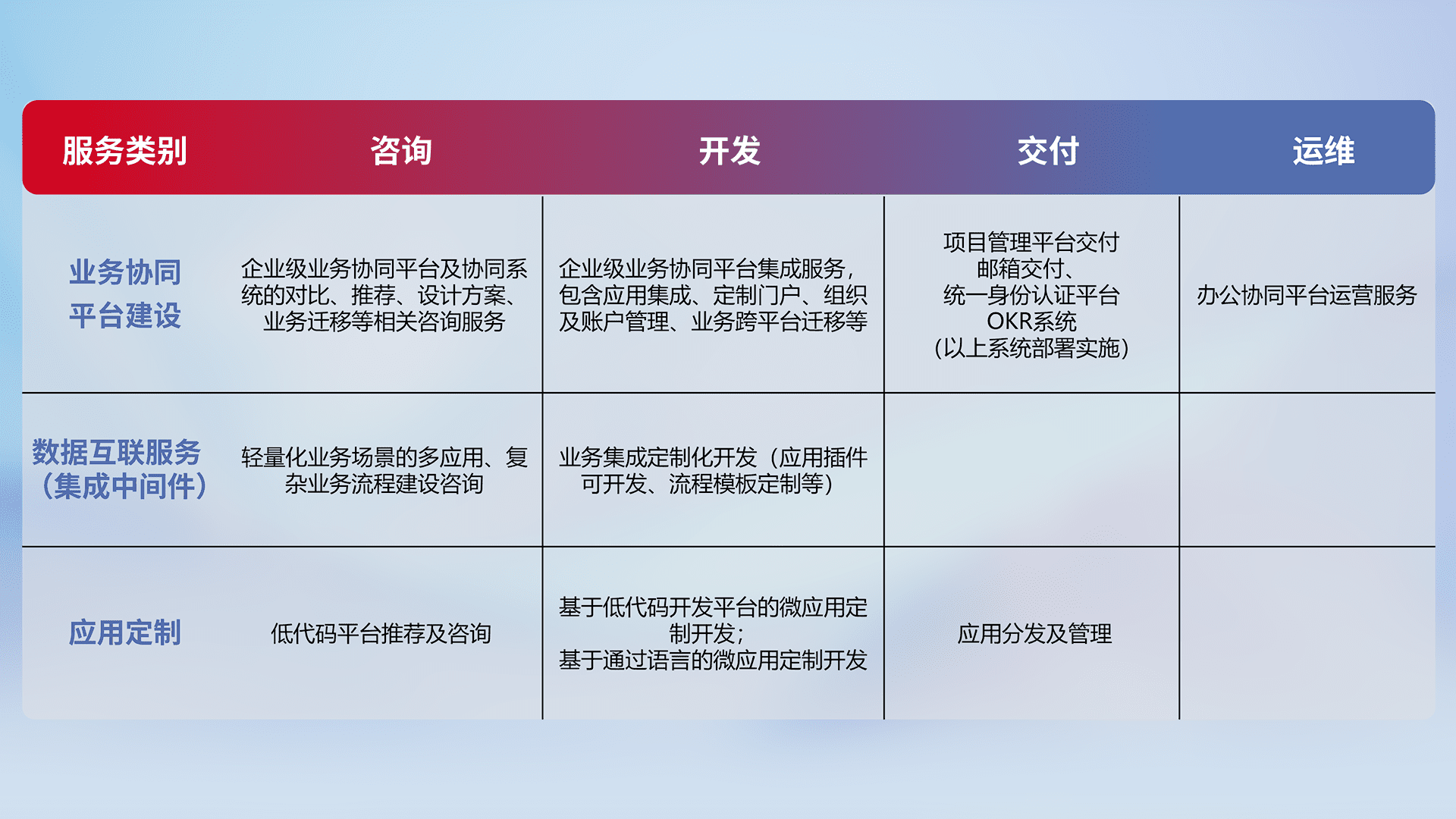 针对钉钉、、、企微、、、、IDaas等平台级产品提供产品的规划、、方案、、交付、、、、定制化开发等服务,,实现如统一协同办公、、智能客户服务、、、、混合会议管理、、智能数据查询、、、等业务场景,,,实现数字化转型。。。。